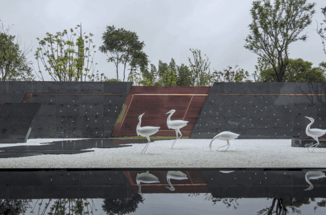 ▲汀步兩邊的雕塑小品,從紙飛機(jī)到紙船,而后化為白鷺,暗喻著走過(guò)世界的重慶人,在徜徉四海后由熱鬧歸于平靜。