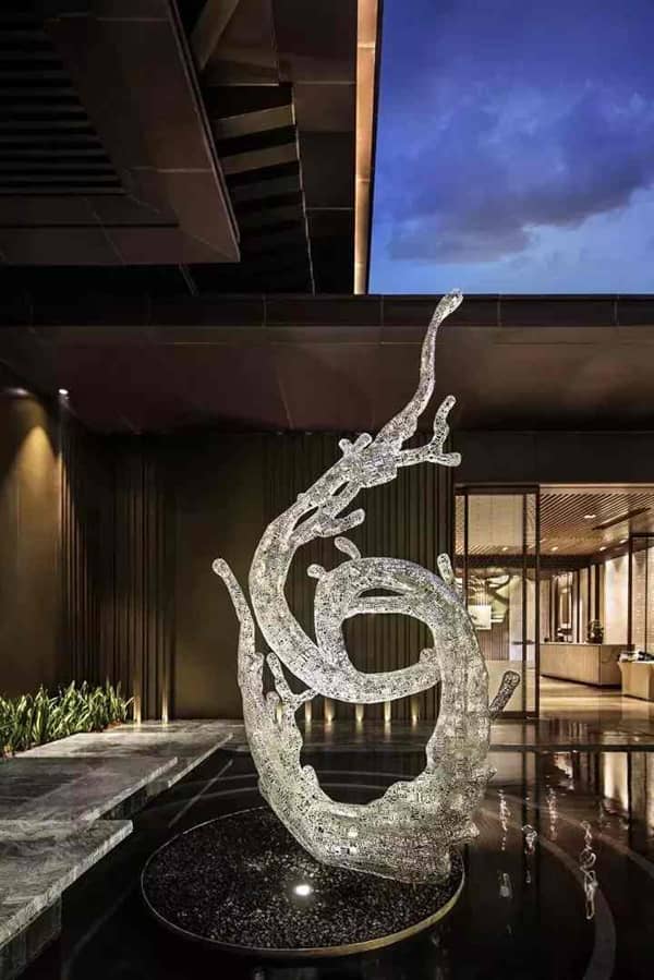 水面上,波浪造型的雕塑應(yīng)景而躍動(dòng)。